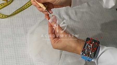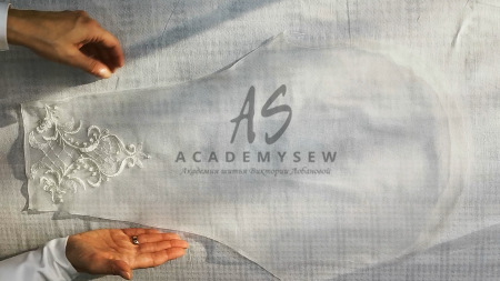 Наши рукава двухслойные. Причем нижний слой - фатин чуть пожесче. Это сделано для того, чтобы получить более стоячий вид рукава, с одной стороны, и с другой, обработать рукав чистым, закрытым способом.