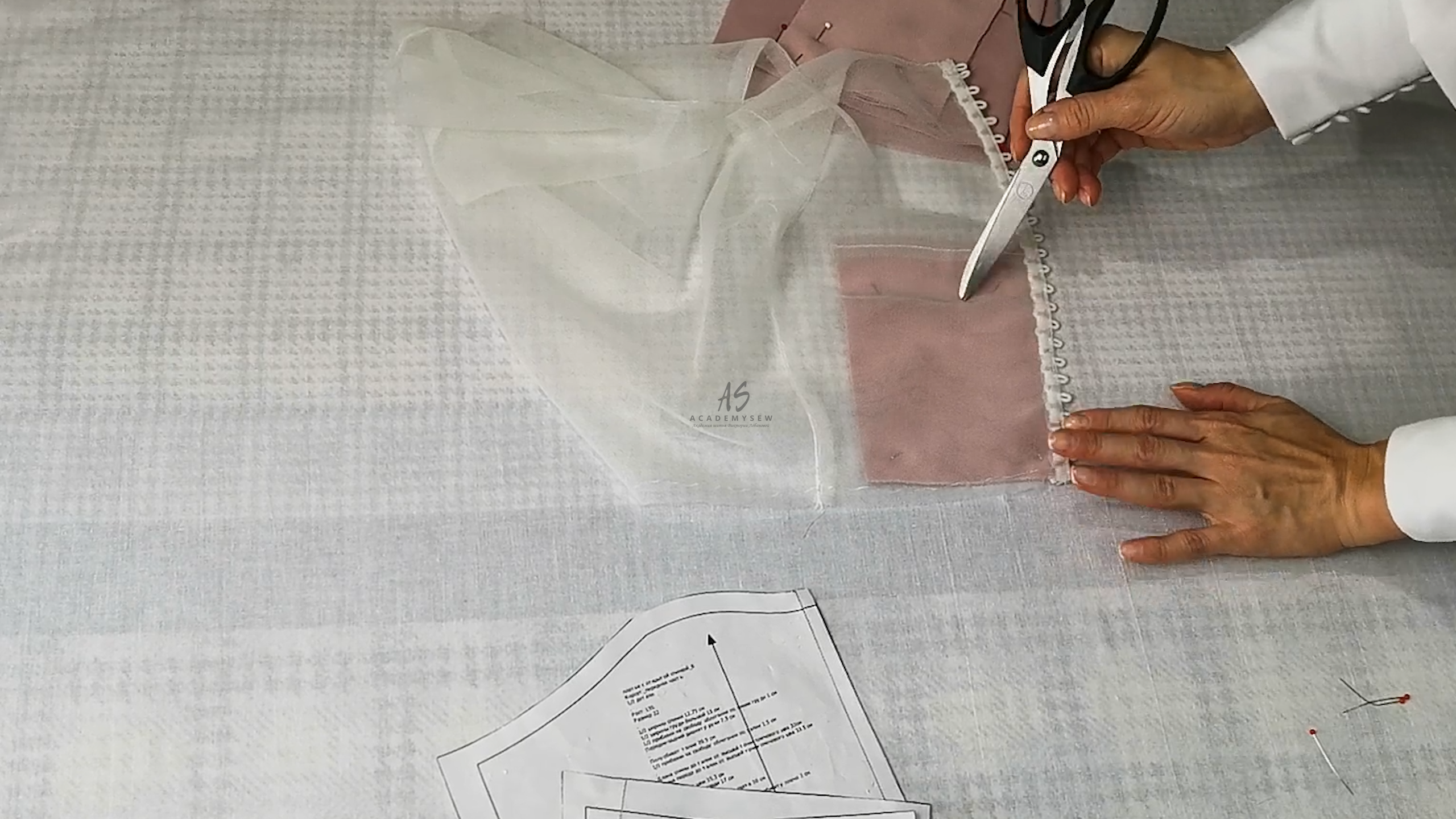 Чтобы верхний срез не тянул, мы надсекаем припуски и срезаем лишнюю ширину до 0,4 см от первоначального шва.